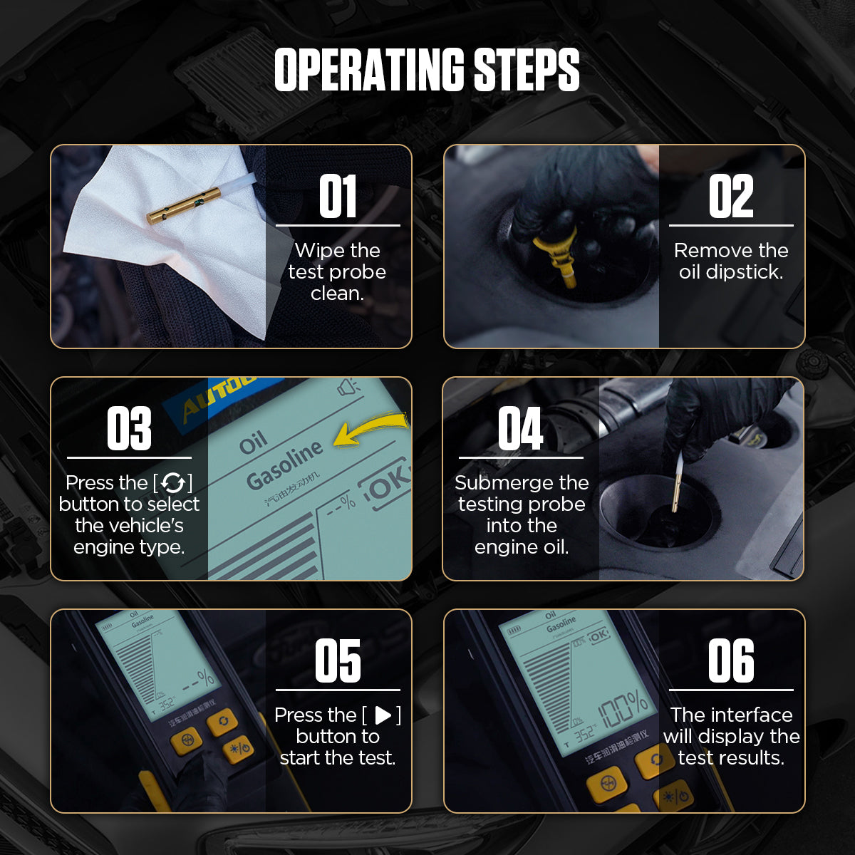 A készülék a legtöbb piacon kapható motorolaj típushoz használható, külön mintavételi üzemmódokkal a benzines és dízel motorokhoz, így még pontosabb értékelést biztosít. -
