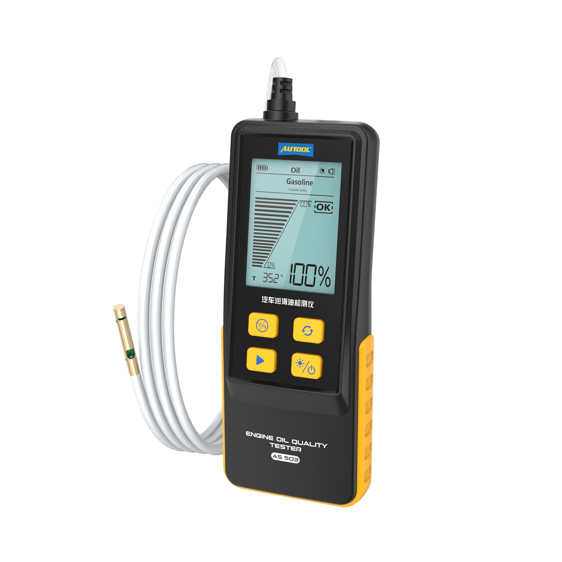 AUTOOL AS503 motorolaj teszter benzines és dízel motorokhoz. Pontos olajminőség- és hőmérsékletmérés, LCD kijelző, 800 mm-es olajálló szonda. 3 év garancia.