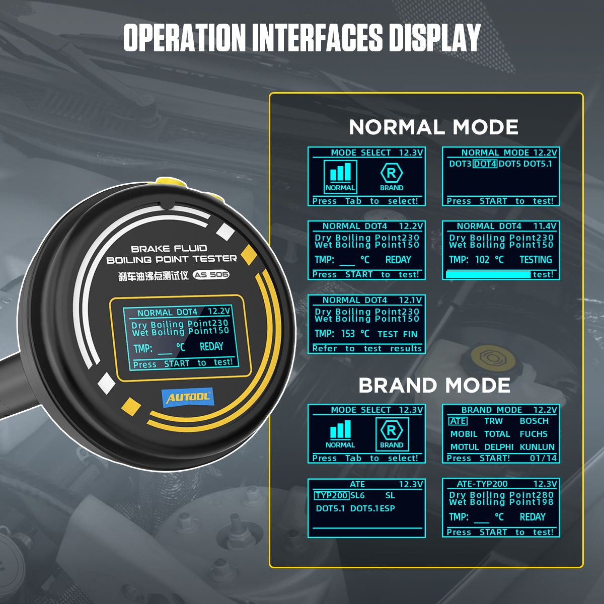 AUTOOL AS506 fékfolyadék teszter kettős üzemmóddal, 16 másodperces mérési idővel és forráspont-meghatározással. Professzionális diagnosztika autószervizeknek és szerelőknek.