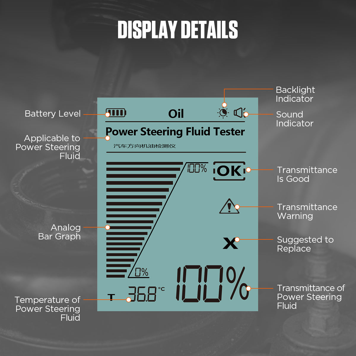 Az AUTOOL AS507 Power Steering Fluid Tester egy fejlett autódiagnosztikai eszköz, amelyet kifejezetten a szervokormány-rendszer olajminőségének vizsgálatára fejlesztettek ki. A készülék nagy pontosságú optikai érzékelőt, beépített hőmérsékletmérőt és hosszú, rugalmas PTFE szondát használ, hogy gyorsan és pontosan megállapítsa a szervoolaj tisztaságát és állapotát.