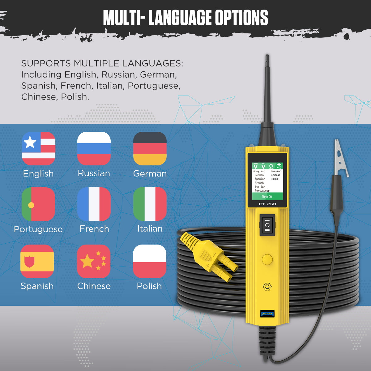 Az AUTOOL BT260 elektromos áramkör teszter egy sokoldalú és precíz diagnosztikai eszköz, amelyet kifejezetten járművillamossági szakemberek és műhelyek számára fejlesztettek ki. Támogatja a 12V és 24V rendszereket, így személyautók, teherautók, motorkerékpárok, hajók és más járművek elektromos hibáinak gyors feltárására alkalmas.