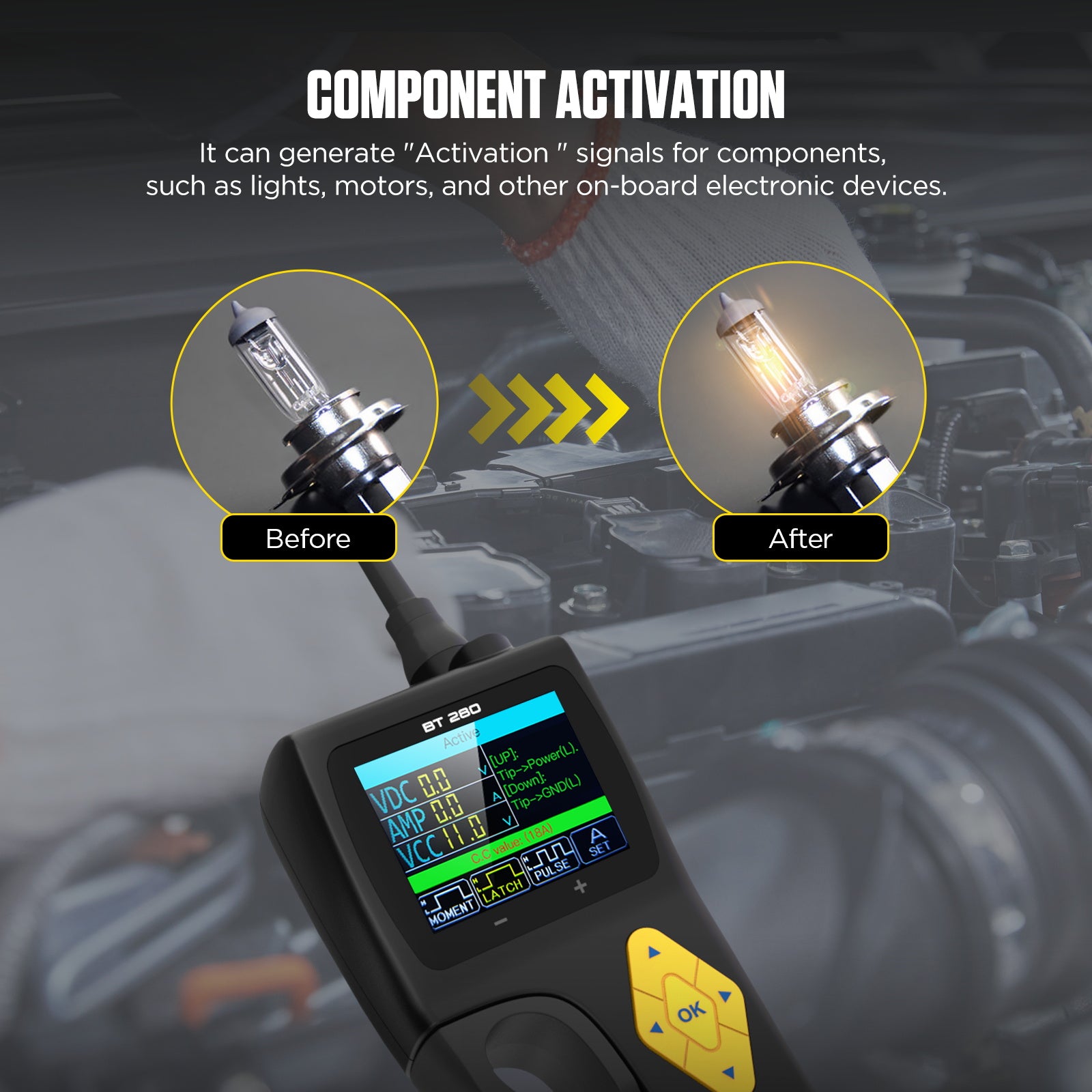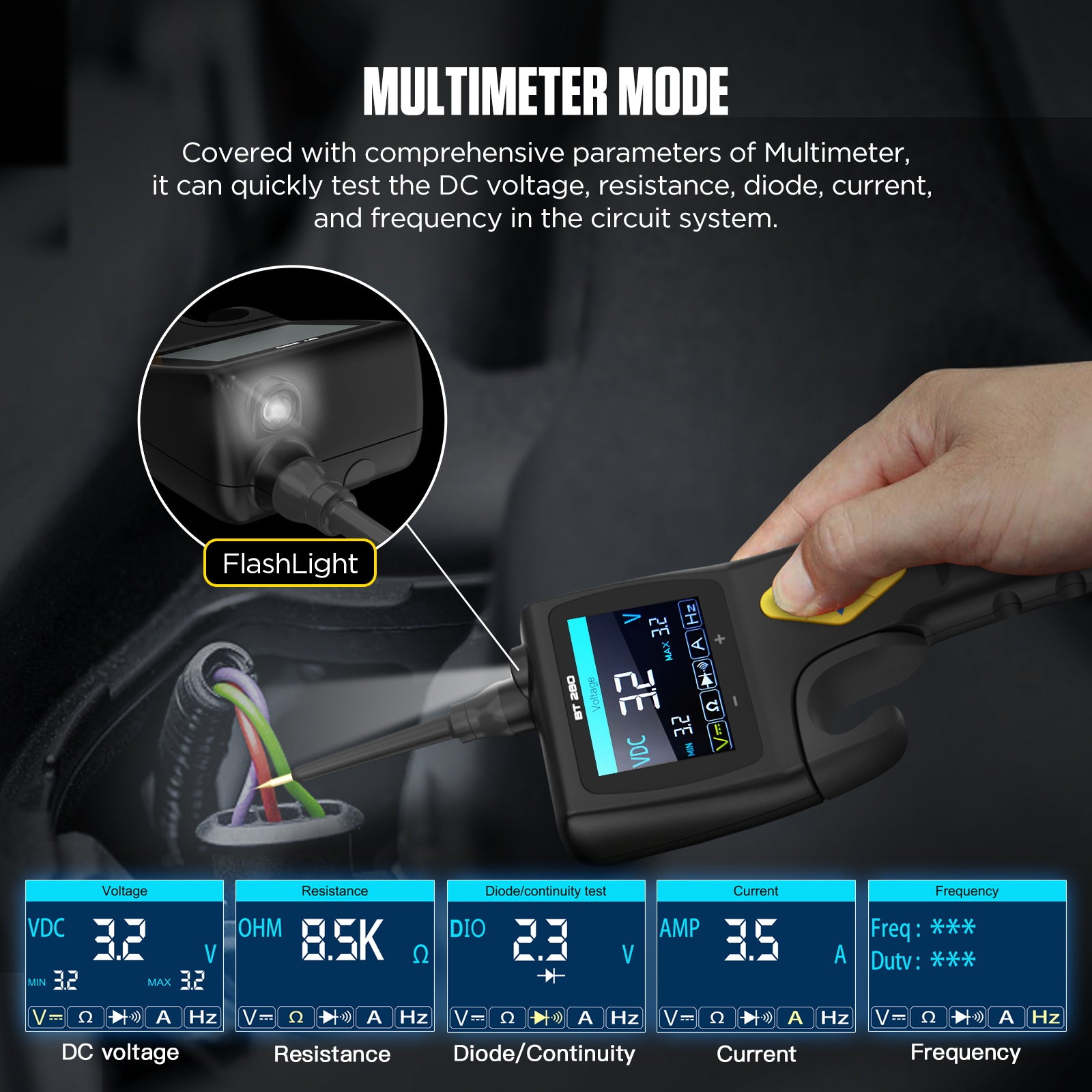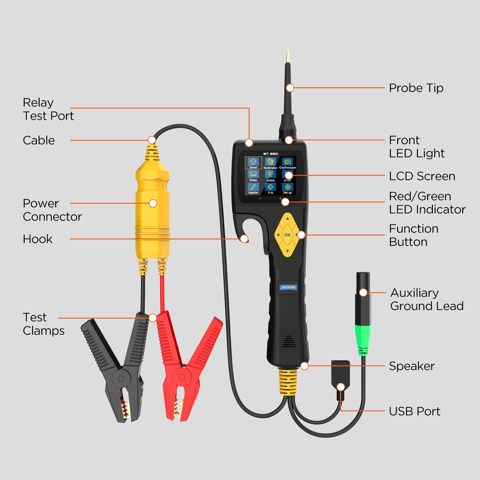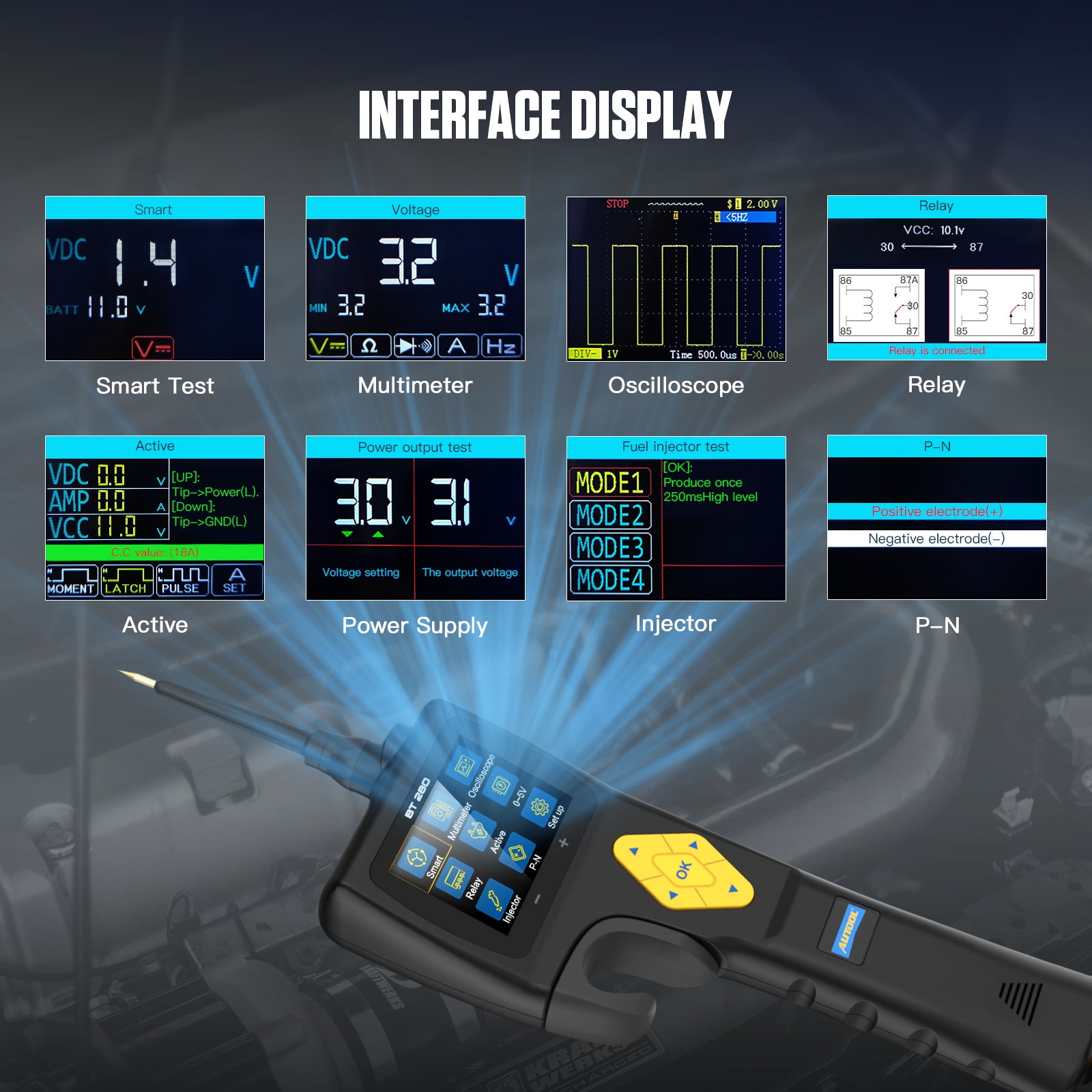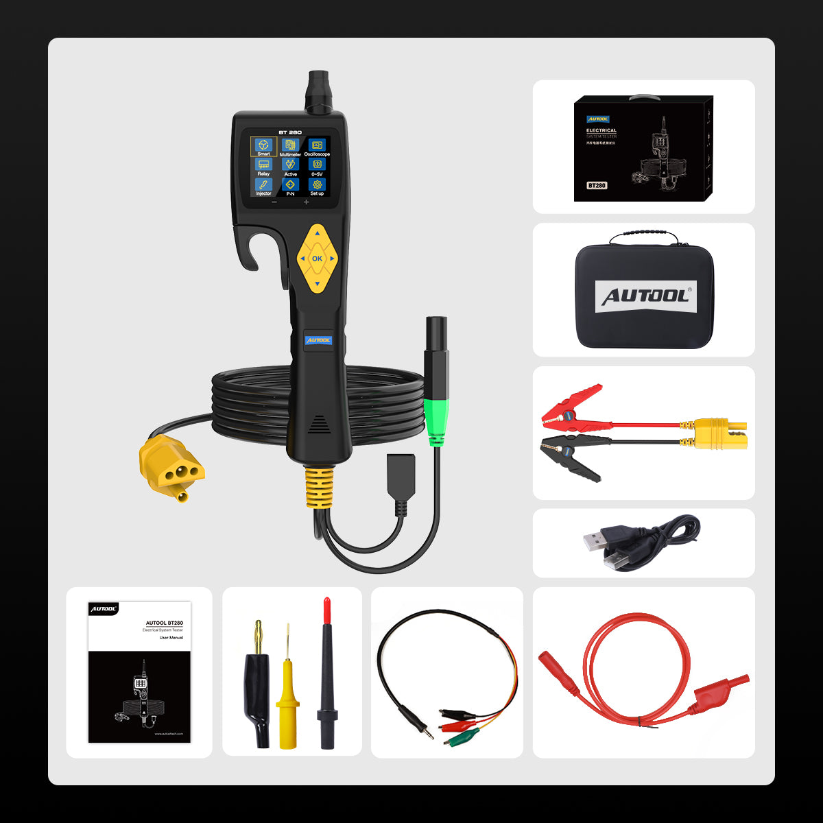 Az AUTOOL BT280 az elektromos rendszertesztelők legújabb generációja, amely egyetlen készülékben ötvözi a multiméter, oszcilloszkóp, relétesztelő és injektortesztelő funkciókat.