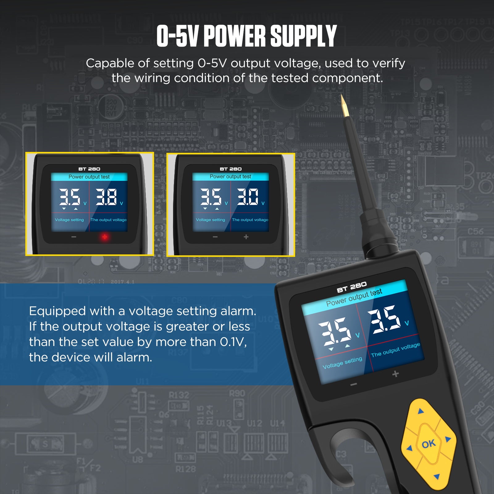 A 0–5V-os állítható kimeneti feszültség funkcióval ellenőrizhető a vezetékek állapota, és beépített feszültségriasztás figyelmeztet, ha az értékek a beállított határértékeken kívül esnek.