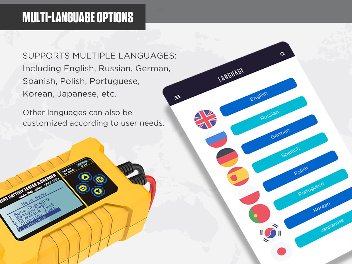 A BT380 kompatibilis számos akkumulátortípussal: hagyományos ólom-savas, AGM lapos és spirálcellás, valamint GEL akkumulátorokkal. Támogatja a legelterjedtebb nemzetközi tesztelési szabványokat (CCA, JIS, DIN, IEC, EN, SAE, GB), így megbízható mérési eredményeket biztosít.