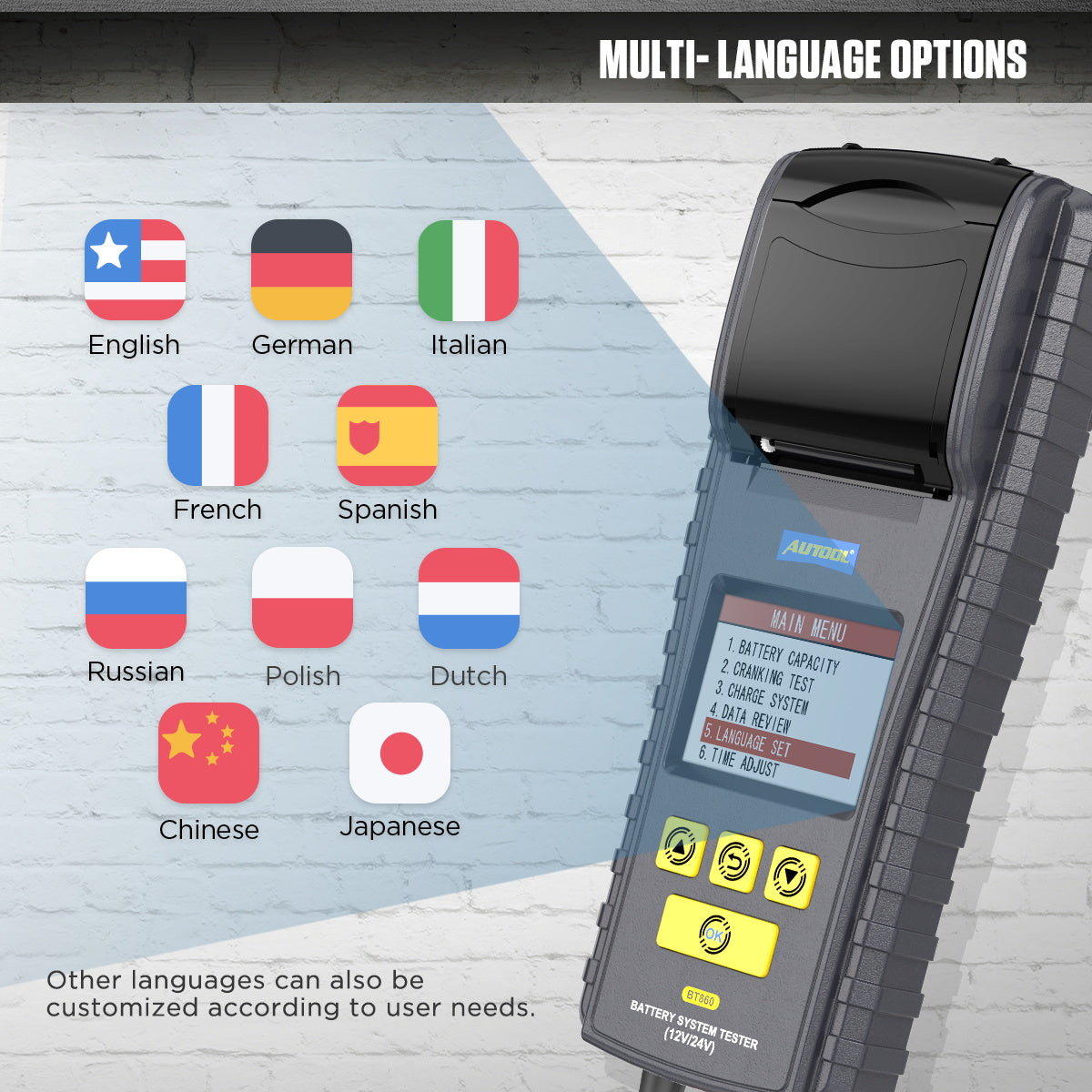 Az AUTOOL BT860 egy profi akkumulátor teszter 12V/24V rendszerekhez, valós idejű hőmérséklet-monitorral, beépített nyomtatóval és színes kijelzővel. Pontos CCA, indítási és töltőrendszer mérés.