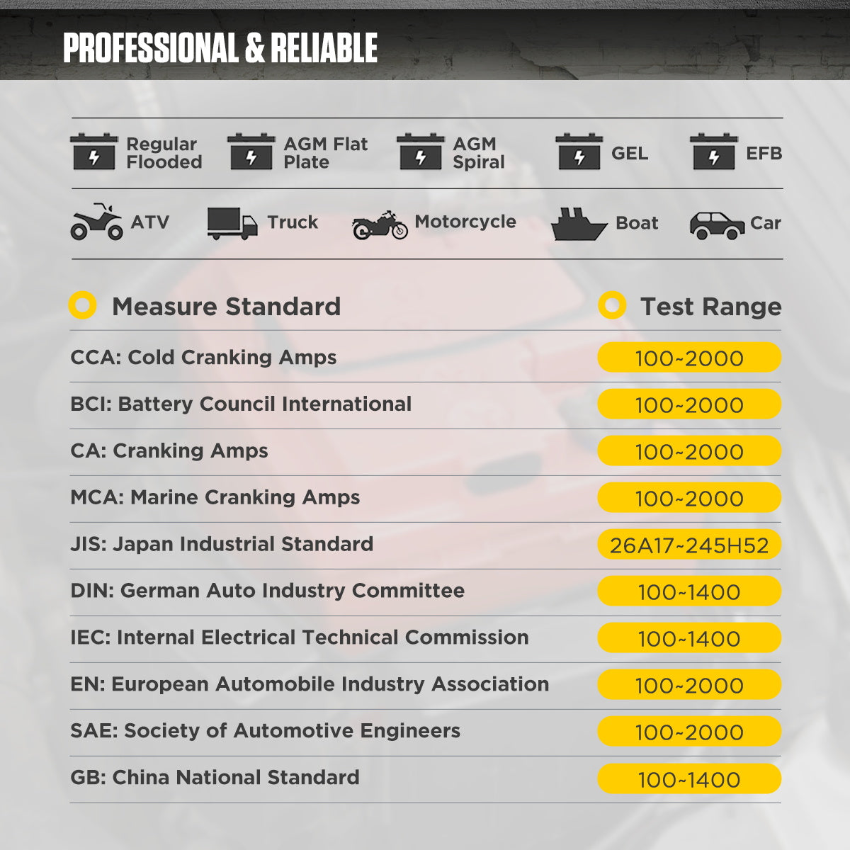 A BT860 széles körben alkalmazható személyautókhoz, motorkerékpárokhoz, teherautókhoz, SUV-okhoz, hajókhoz és más 12V/24V akkumulátoros rendszerekhez. Támogatott szabványok: CCA, IEC, EN, DIN, JIS.