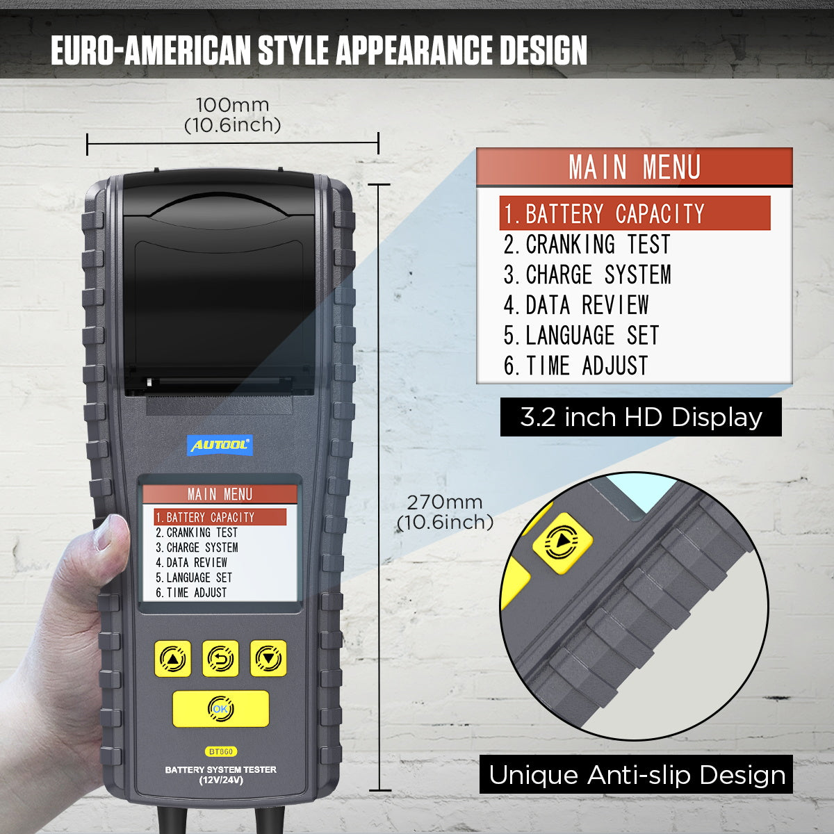 AUTOOL BT860 – 12V/24V Akkumulátor Teszter Hőmérséklet-figyeléssel és Nyomtatóval