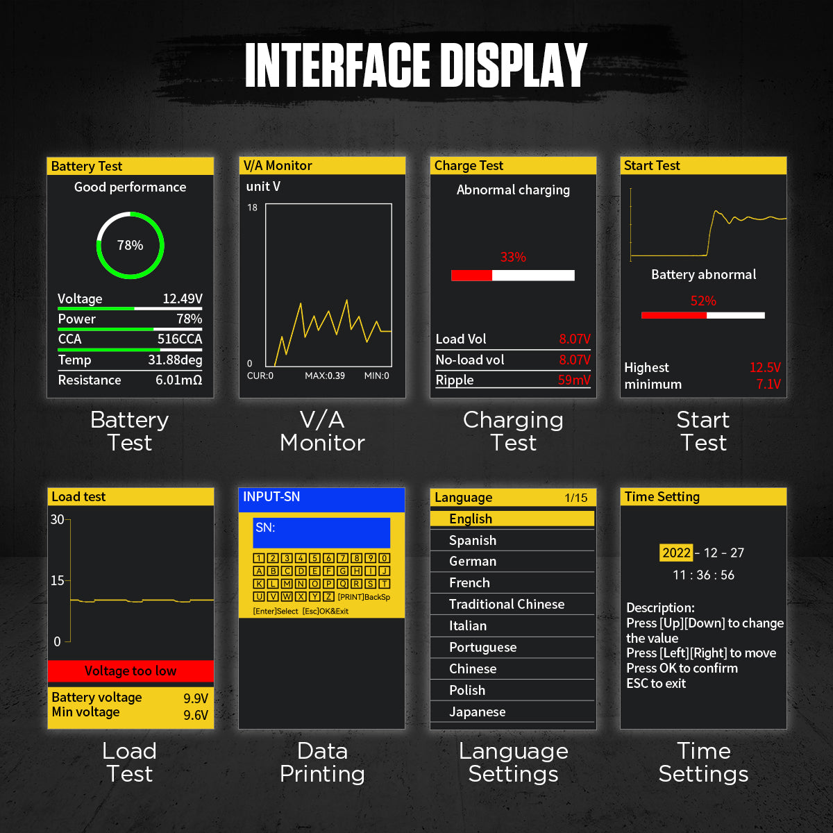 CCA mérési tartomány: 20–2000 CCA (JIS, GB, SAE, MCA, DIN, IEC, EN, BCI szabványok)
