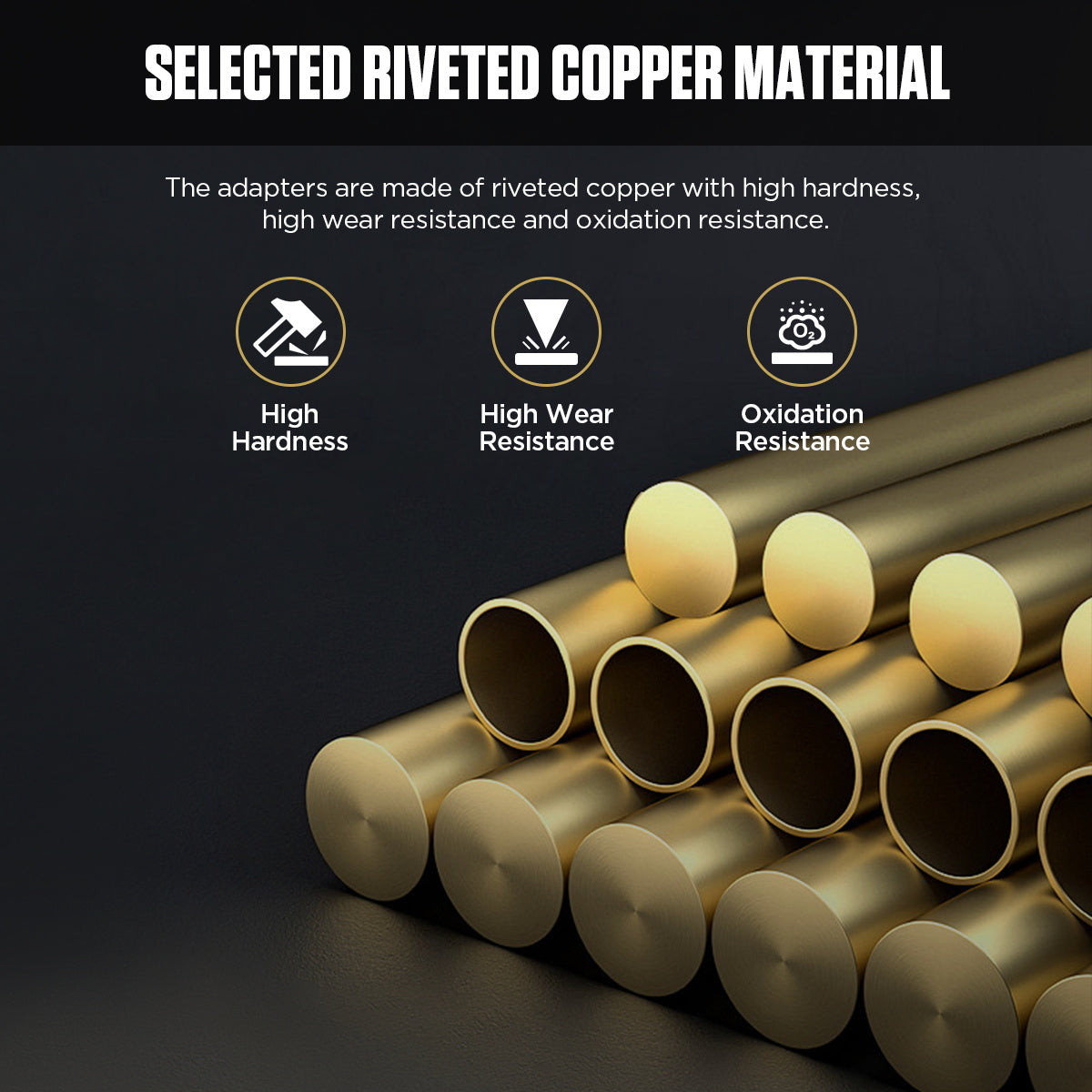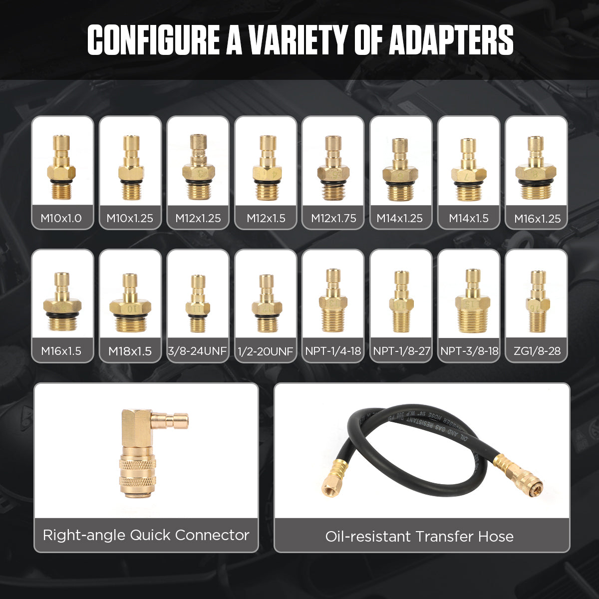A 0–426,6 PSI / 0–30 kg/cm² / 0–29,4 bar tartomány 0,01 felbontással jelenik meg. A szegecselt réz idomok és a megerősített gumi tömlő együtt hosszú élettartamot és üzembiztonságot garantálnak, még intenzív műhelyhasználat mellett is.