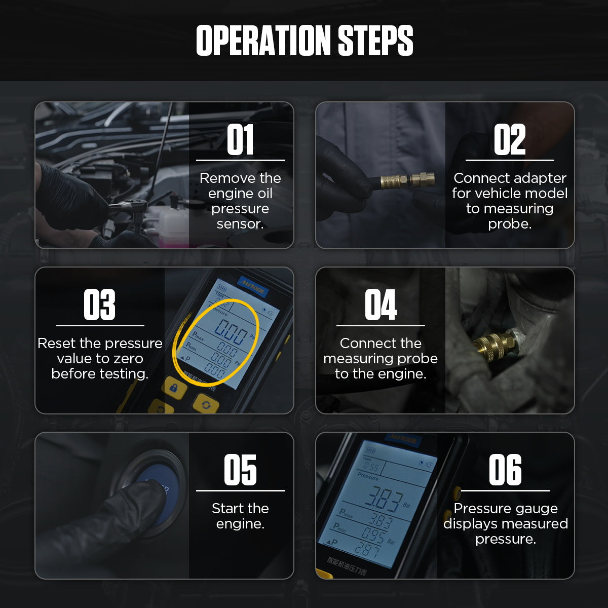 Az AUTOOL PT620 a márka intelligens nyomásmérő családjának motorolaj-nyomás vizsgálatára fejlesztett tagja. Digitális mérőrendszere rendkívül érzékeny, a 2,8 colos háttérvilágítású kijelző pedig valós időben mutatja az aktuális és átlagos olajnyomást, a motorolaj hőmérsékletét, valamint a mérési időt. A készülék legfeljebb 6 mérési készletet tud elmenteni és zárolni, így visszakereshető és összehasonlítható a különféle állapotokban (pl. hideg-meleg, alapjárat-terhelés) felvett adat.