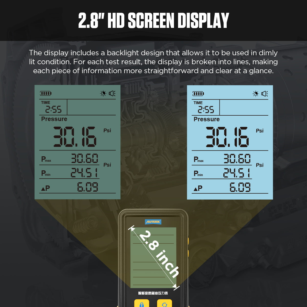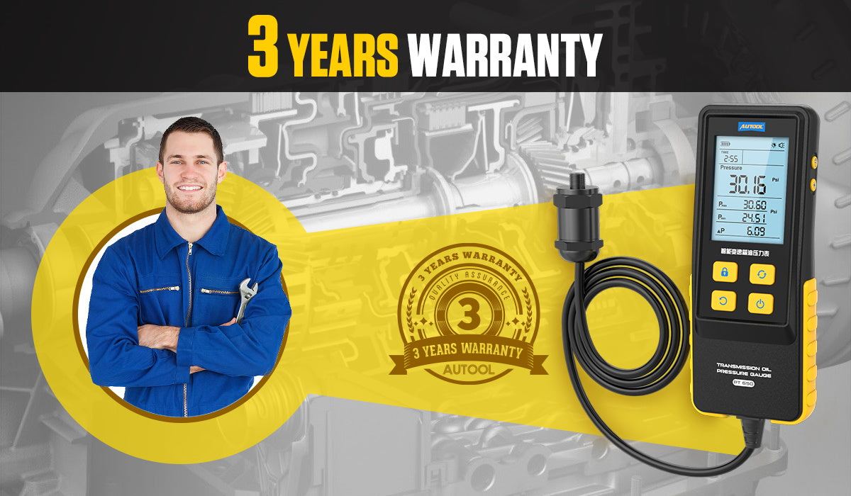 Az AUTOOL PT650 a váltóolaj (ATF) nyomás mérésére tervezett intelligens mérőeszköz. A digitális mérőrendszer nagy pontosságot és 0,01 kijelzési felbontást nyújt, a 2,8" háttérvilágítású kijelző pedig jól olvasható még sötét motortérben is. A készülék valós idejű és átlagnyomás megjelenítésére képes, a gyártói leírás szerint a folyadékhőmérséklet és a mérési idő kijelzése is elérhető, ami a váltó működési hőmérsékletét figyelembe vevő diagnosztikához létfontosságú.