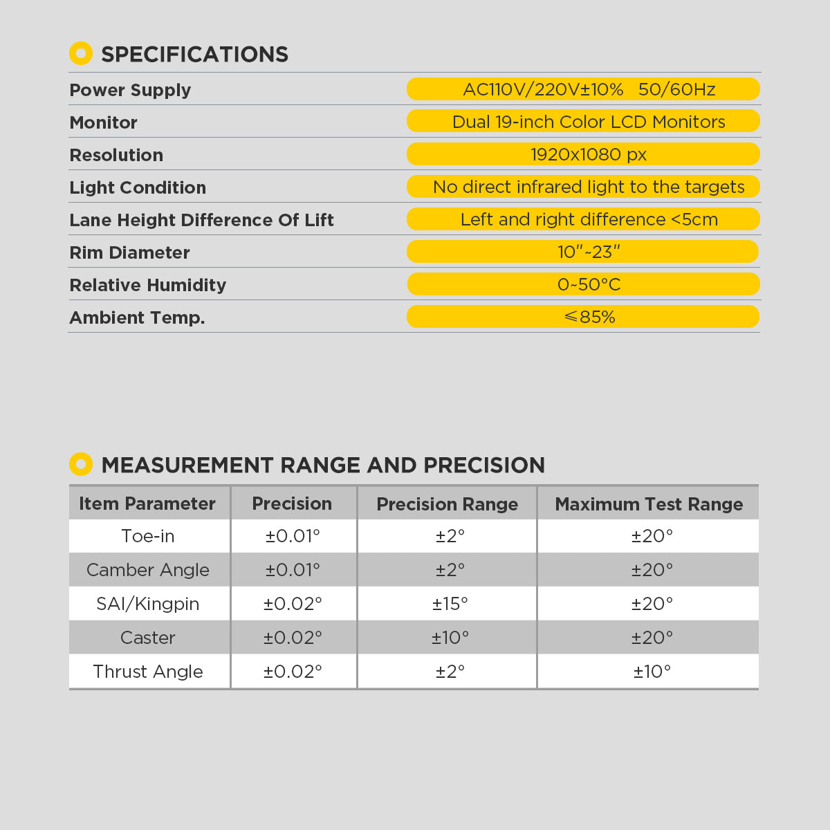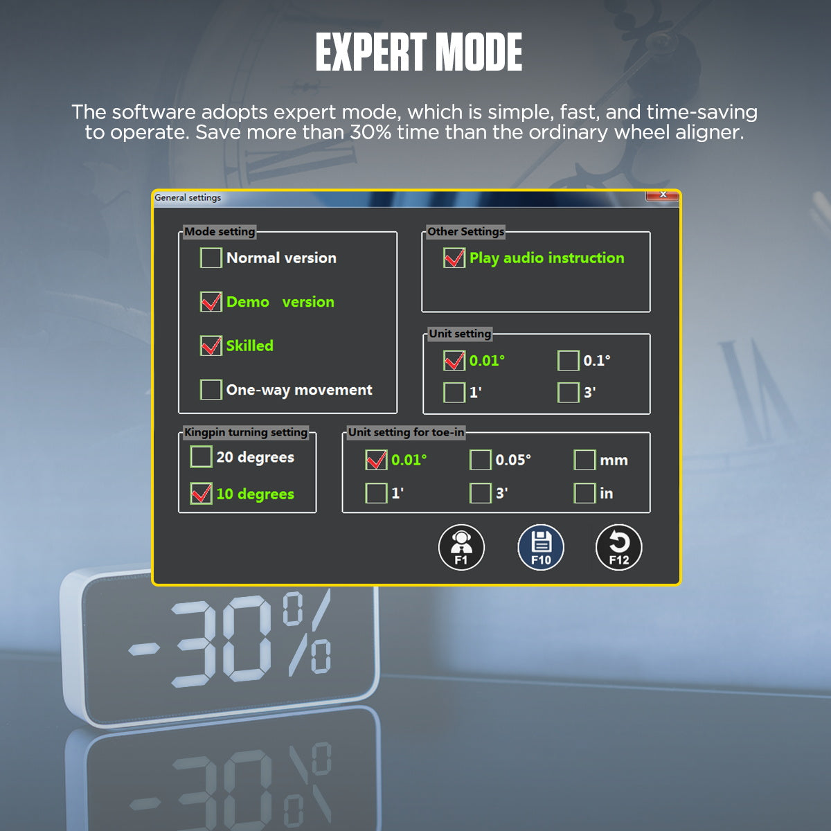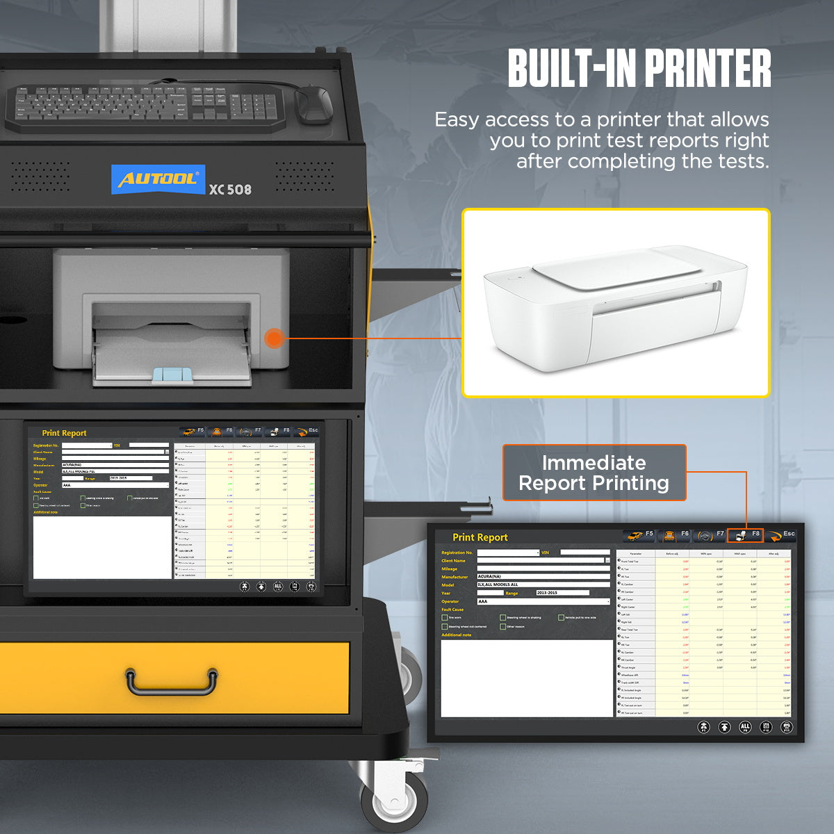 A berendezés hang- és LED-es irányítással, teljes járműméret-mérő rendszerrel, okos követő funkcióval, két kijelzővel és beépített nyomtatóval rendelkezik.