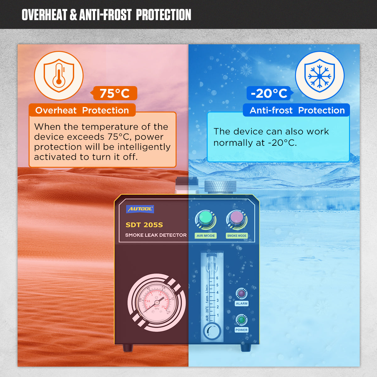 Gyors füstképzés 10 másodperc alatt – Az AUTOOL SDT205S lehetővé teszi, hogy pillanatok alatt detektáld az autó rendszereiben lévő szivárgásokat, ezzel jelentősen csökkentve a diagnosztikai időt.