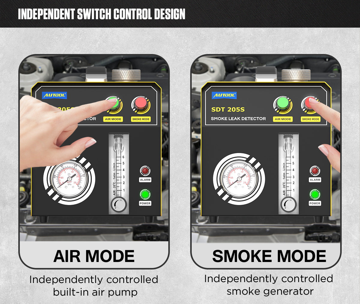 Kettős üzemmód – Lég- és füstüzem – Beépített légszivattyúval és füstgenerátorral, így nincs szükség külön kompresszorra. Ideális mobil autójavítási feladatokra is.