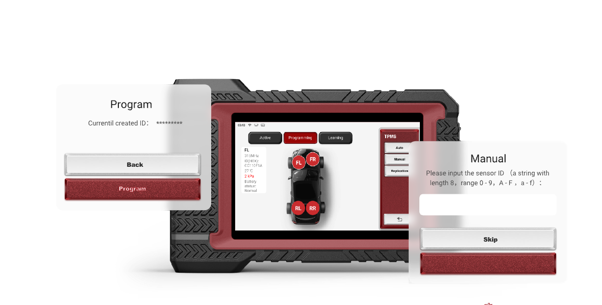 Az eszköz beépített TPMS modullal rendelkezik, amely lehetővé teszi a TPMS szenzorok aktiválását, programozását és betanítását. A csomagban található 5 db TPMS S1 univerzális szenzor képes helyettesíteni a gyári 315 MHz és 433 MHz frekvenciás érzékelőket, így rugalmas és költséghatékony megoldást kínál a műhelyek számára.