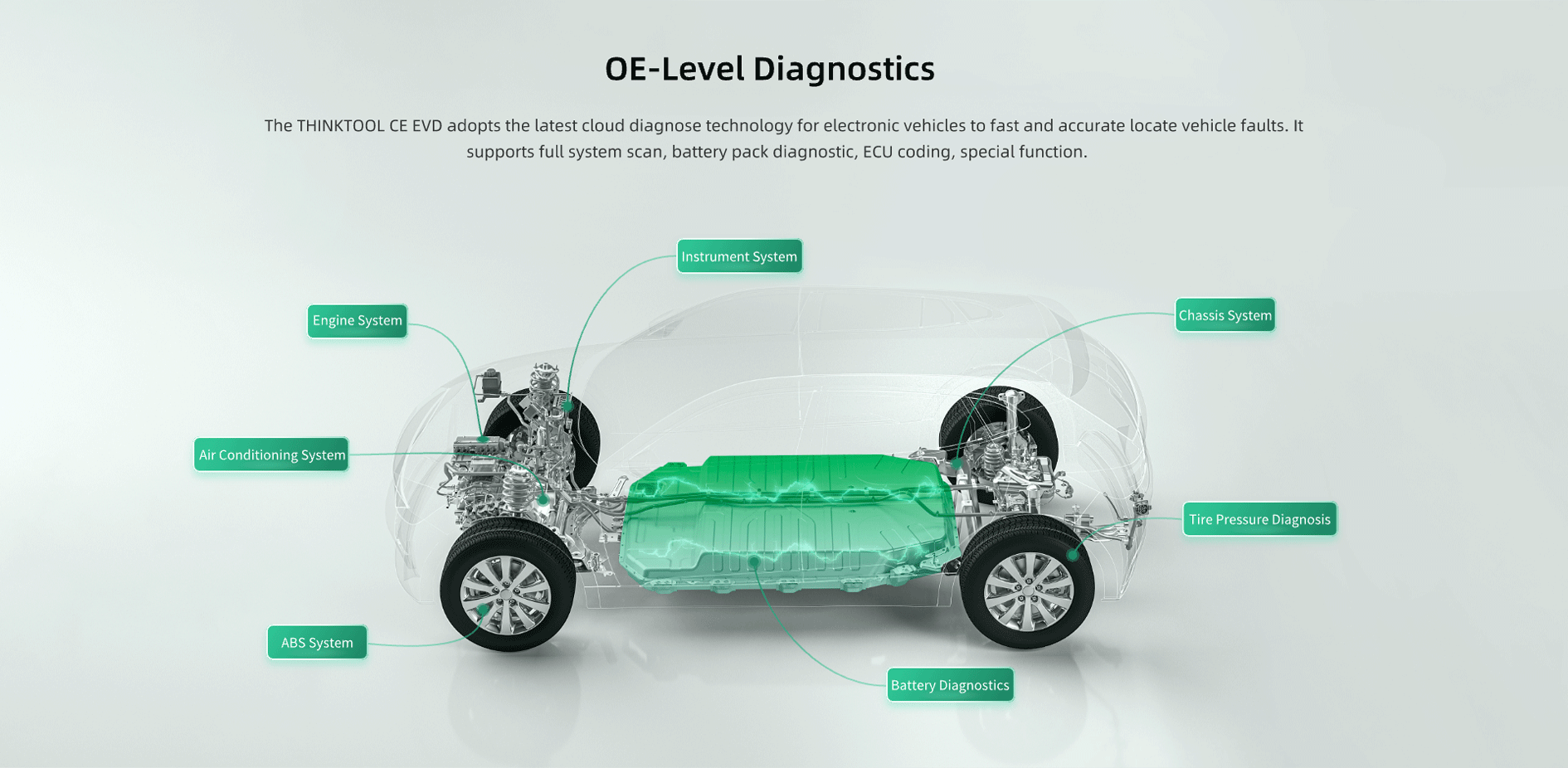 A készülék célja, hogy átfogó megoldást nyújtson az elektromos autók gyors, pontos és biztonságos hibafeltárásához. A ThinkTool CE EVD támogatja a teljes járműrendszer diagnosztikát, beleértve az akkumulátor menedzsment rendszert (BMS), a töltő- és inverterrendszert, valamint az elektromos hajtáslánc vezérlőegységeit is.