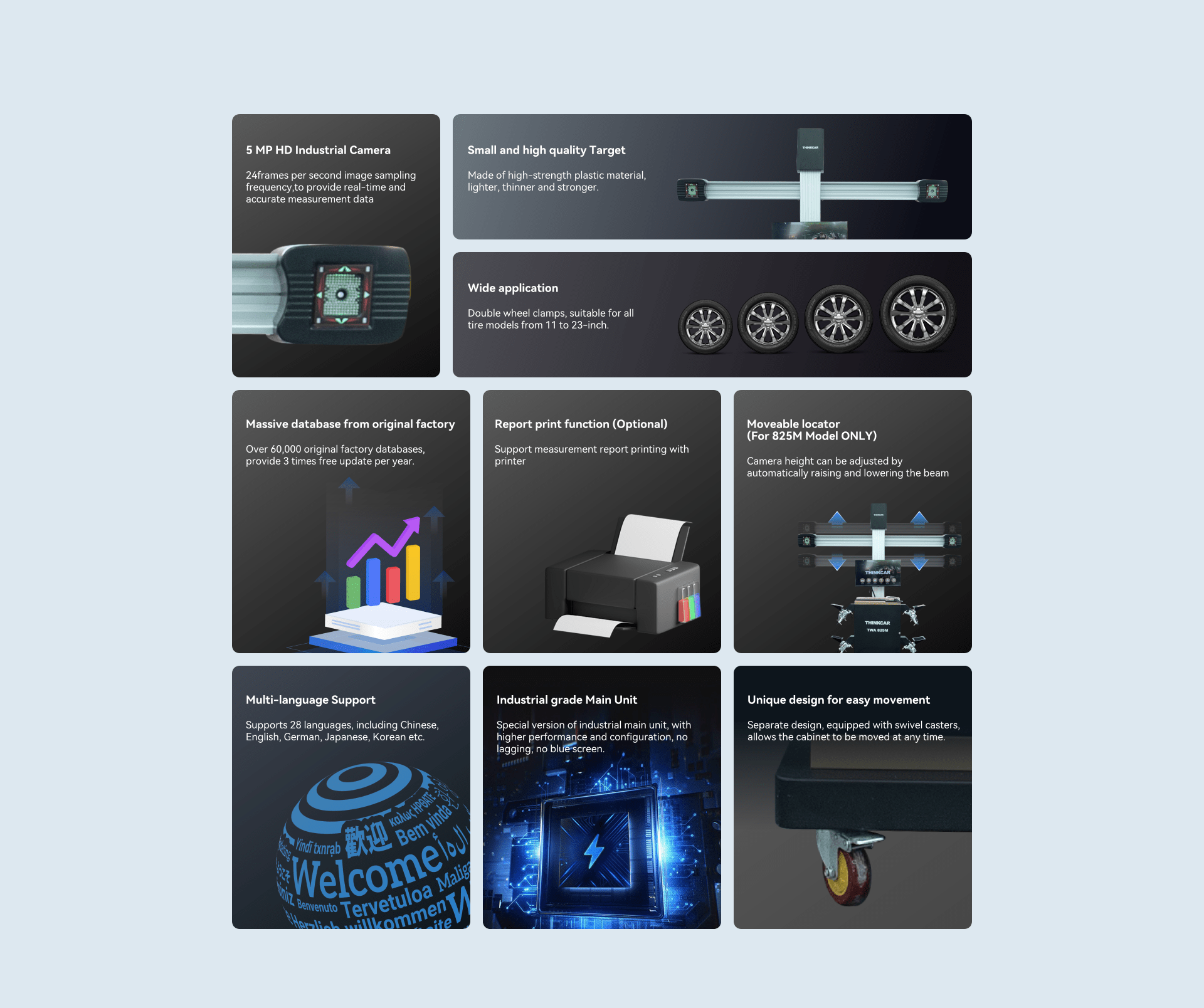A THINKCAR TWA 825 és 825M professzionális 3D futóműállító gépek nagy pontosságú mérőrendszerrel és ipari HD kamerával rendelkeznek. Gyors, precíz és egyszerű futómű diagnosztika és beállítás autószervizek és gumiszervizek számára.