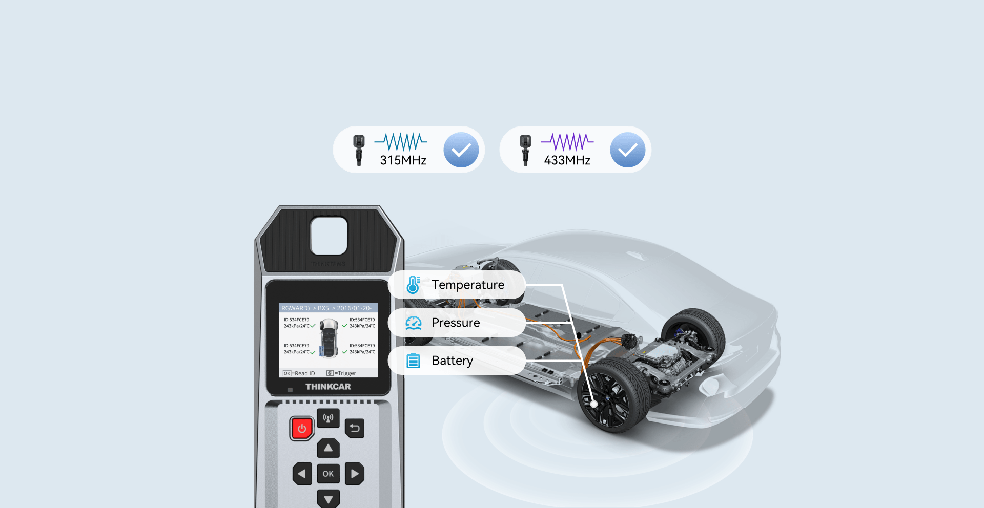 A THINKCAR VENU 90 egy önállóan működő TPMS diagnosztikai eszköz, amely támogatja a 315 MHz és 433 MHz érzékelőket. Aktiválásra, programozásra és betanításra alkalmas, élettartamig ingyenes Wi-Fi frissítésekkel.